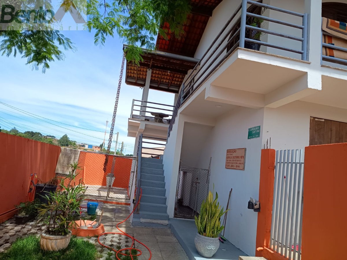 Na parte superior possui três quartos, sendo uma suíte, banheiro social, sala de estar e jantar, além de ambiente para cozinhar, também churrasqueira com sacada e área de serviço.